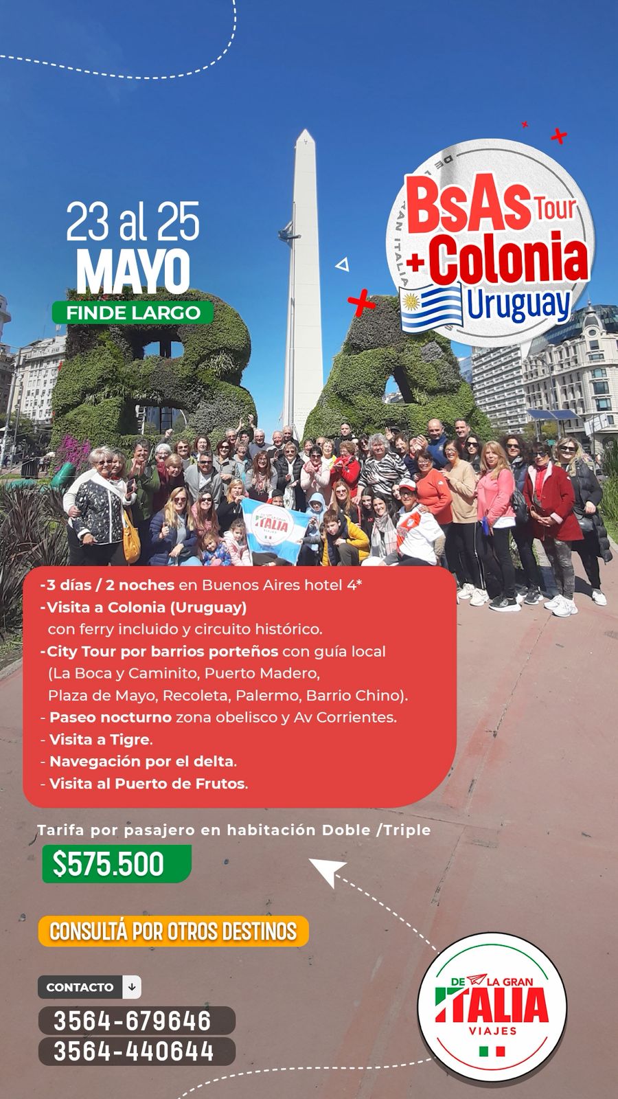 23 al 25 de mayo (Finde largo) - Salida grupal desde San Francisco y zona en BUS MIX - 3 días / 2 noches en Buenos Aires hotel 4* con MEDIA PENSIÓN (Hotel Conte o similar) pleno centro - Visitas incluidas: Visita a Colonia (Uruguay) día completo con ferry incluido y circuito histórico - City Tour por barrios porteños con guía local (La Boca y Caminito, Puerto Madero, Plaza de Mayo, Recoleta, Palermo, Barrio Chino) - Paseo nocturno zona obelisco y Av Corrientes - Visita a Tigre - Navegación por el delta en catamarán - Visita al Puerto de Frutos - Además: Asistencia al viajero, coordinador acompañante, servicio a bordo del bus - Opcional coche cama $30.000 por persona - Opcional butacas panorámicas y cafeteras $25.000 por persona - Ruta de embarque: Transito, Arroyito, El Tío, La Francia, Devoto, San Francisco, Clucellas, María Juana, Sastre, San Jorge.